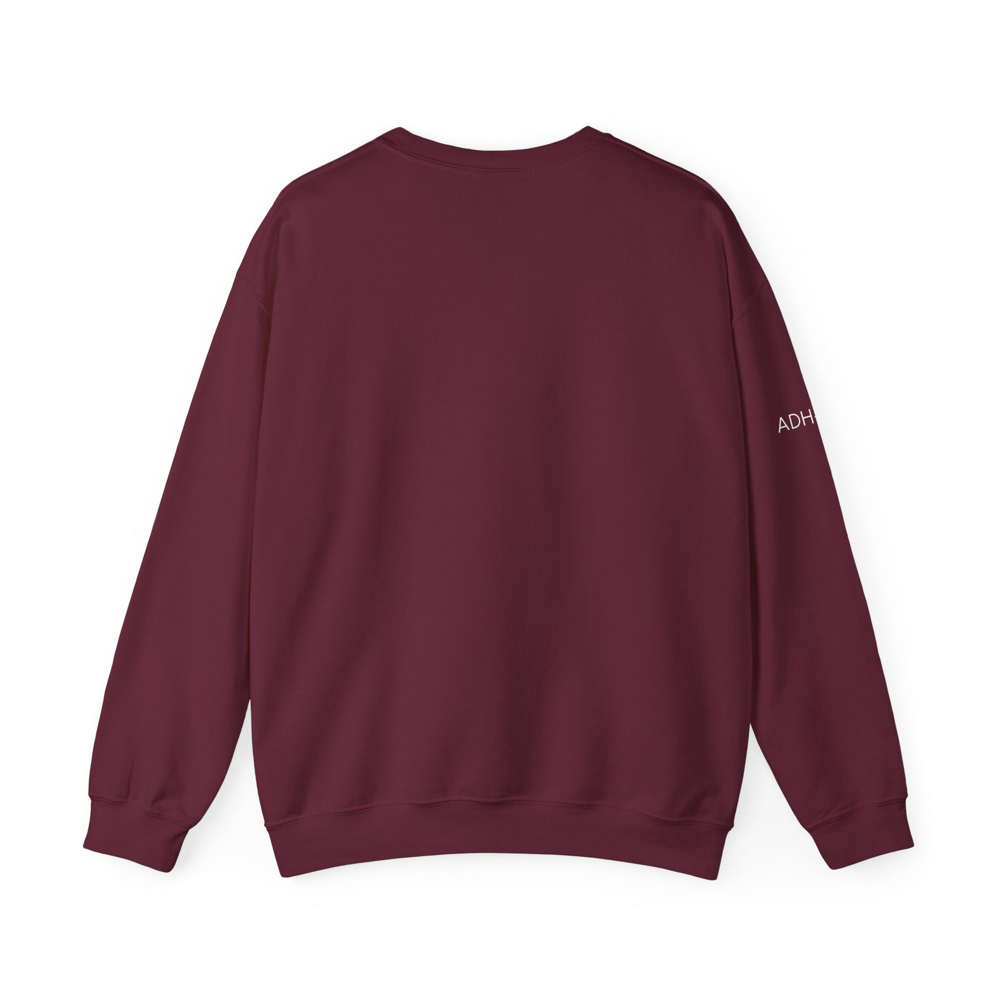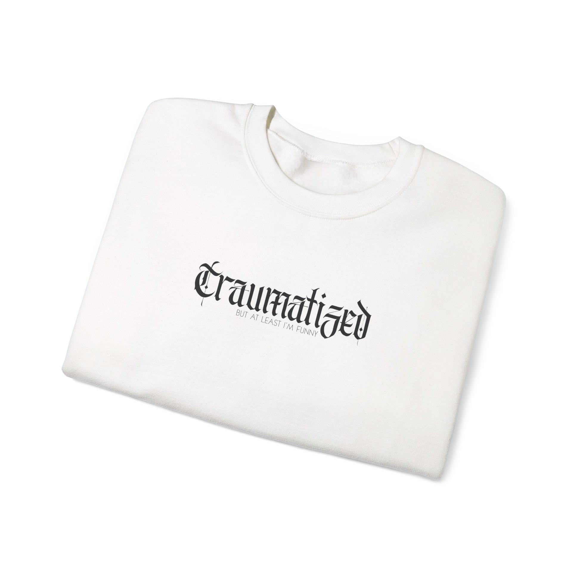 Soft, slightly sassy, and built to last - the Traumatized Sweatshirt wears its terrible little joke loud enough to be honest and quiet enough to be cozy. The DTG-printed chest reads: "traumatized, but at least I'm funny," giving you a dry, private wink while brushed fleece inside provides comforting warmth for pacing, long focus sessions, or low-energy recovery. The roomy, no-hood cut keeps stimulation low so you can move, fidget, and layer without fuss; tagless labelling, flat seams, and durable double-needle stitching reduce irritation and make long wear gentle. Keep the ADH-She emblem on the sleeve as a soft nod to our little community of people who understand. Print colour varies by garment colour for optimal contrast; machine wash cold and tumble low to keep it soft. Secure it before your to-do list eats the thought.